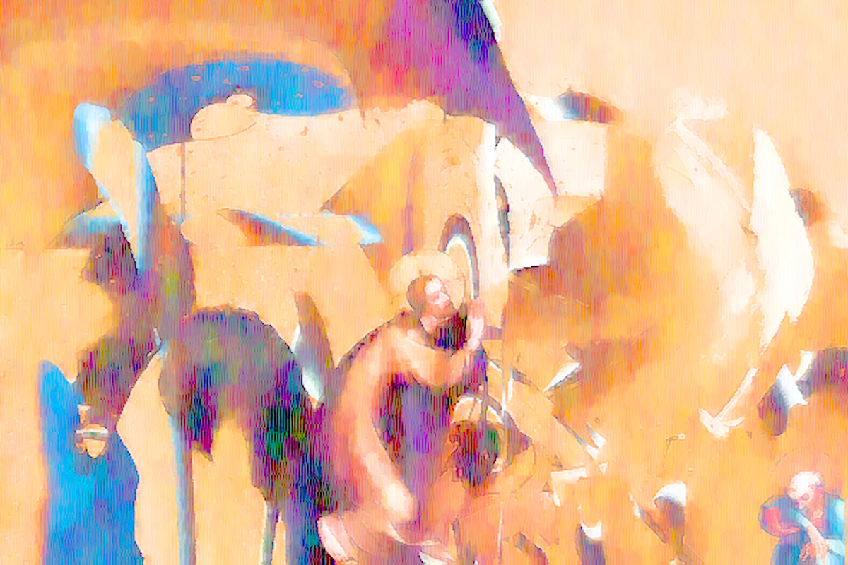 Hints of blue and violet break through the fiery palette, introducing a sense of calm and divine presence amid the chaos. The forms around the figure seem to dissolve into motion, blurring the line between the earthly and the spiritual. This abstraction invites viewers to feel the emotional weight of the moment rather than focus on literal detail.