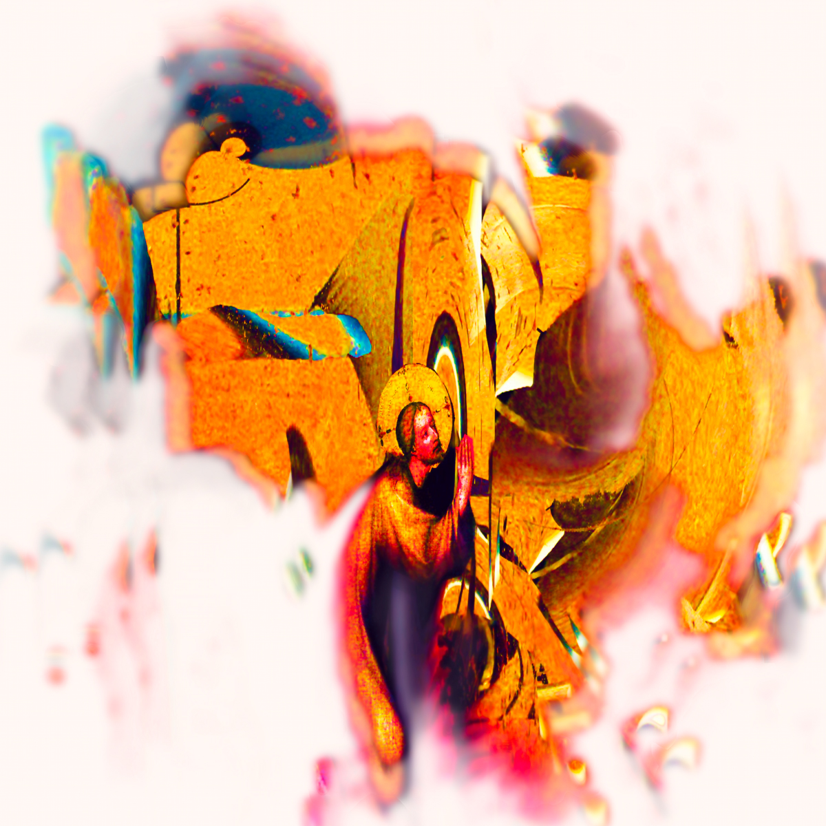 Agony in the Garden V transforms a sacred moment into a luminous digital vision, merging traditional iconography with contemporary abstraction. The praying figure, crowned with a golden halo, stands in sharp relief against fractured textures of radiant gold and crimson. This presence conveys both reverence and vulnerability, anchoring the viewer within a spiritual narrative.