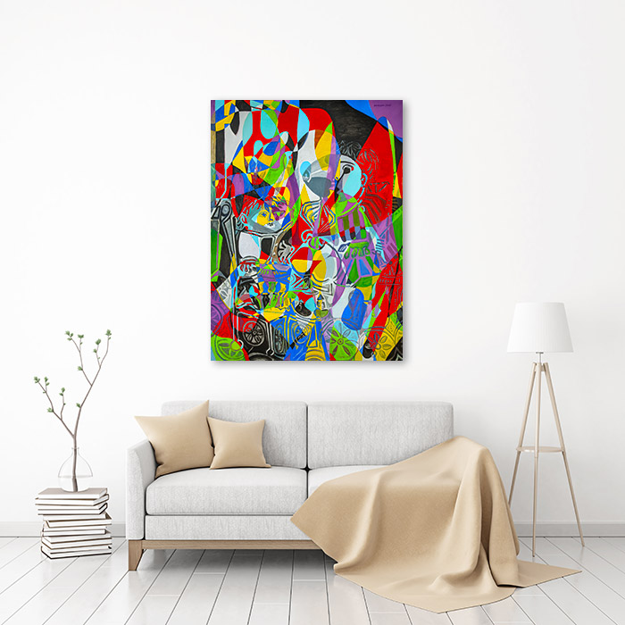 Claude and Paloma (Reflections on works by Pablo Picasso) radiates with vivid energy, capturing childhood innocence through a kaleidoscope of fragmented forms and bold colors. The overlapping planes of red, yellow, blue, and green create a playful yet complex visual rhythm, reflecting both movement and vitality. Within the abstraction, the tender bond of siblings emerges, softened by the geometric chaos surrounding them.