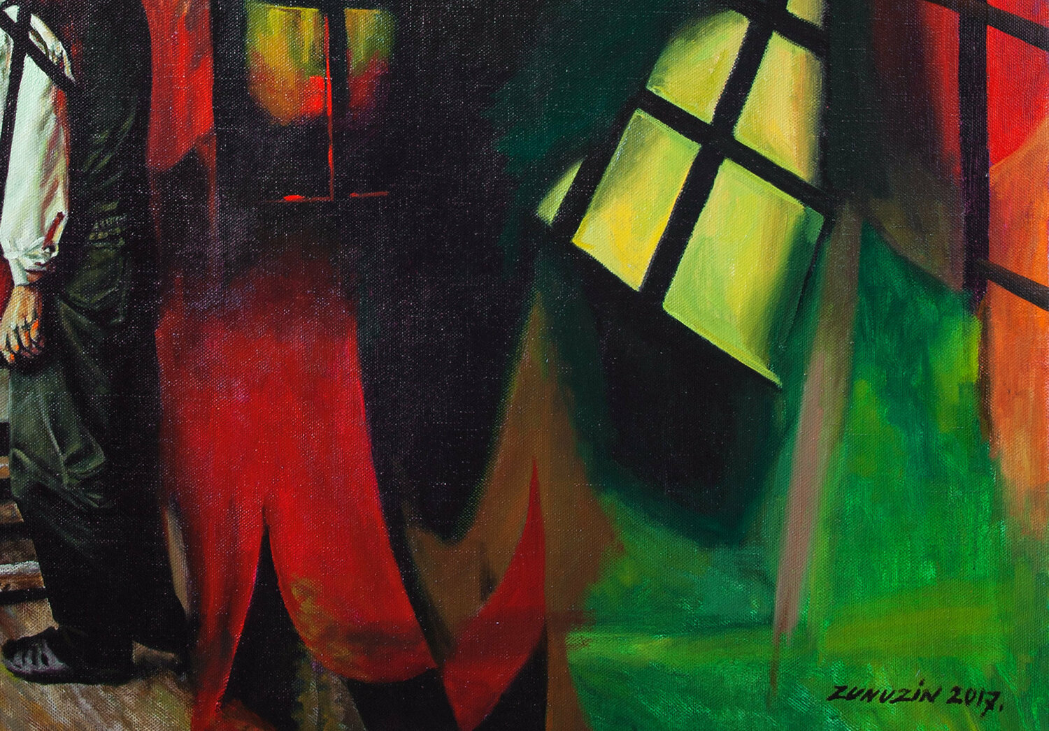 This painting, Dusk – Self-Portrait in Studio, captures a haunting interplay between light, shadow, and solitude. A solitary figure stands in the dim studio, head bowed, absorbed in thought or reflection. The surrounding darkness is broken by streaks of fiery reds, glowing yellows, and patches of green, creating a charged atmosphere that feels both intimate and dramatic.