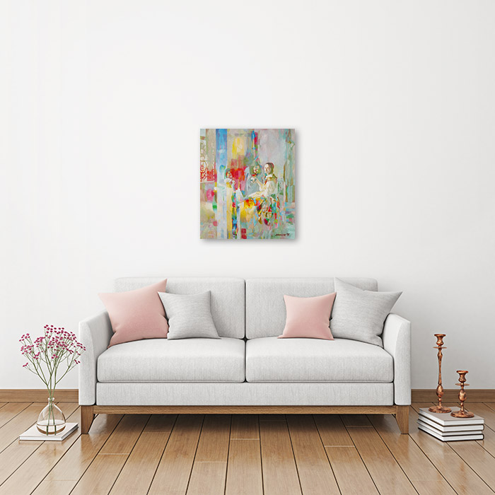 The Girl with the Wine Glass (Jan Vermeer van Delft Improvisation) reimagines Vermeer’s intimate domestic scene through a veil of abstraction and luminous color. The familiar figures remain visible, yet they dissolve into painterly fragments, their forms emerging from shifting planes of reds, yellows, and soft pastels.