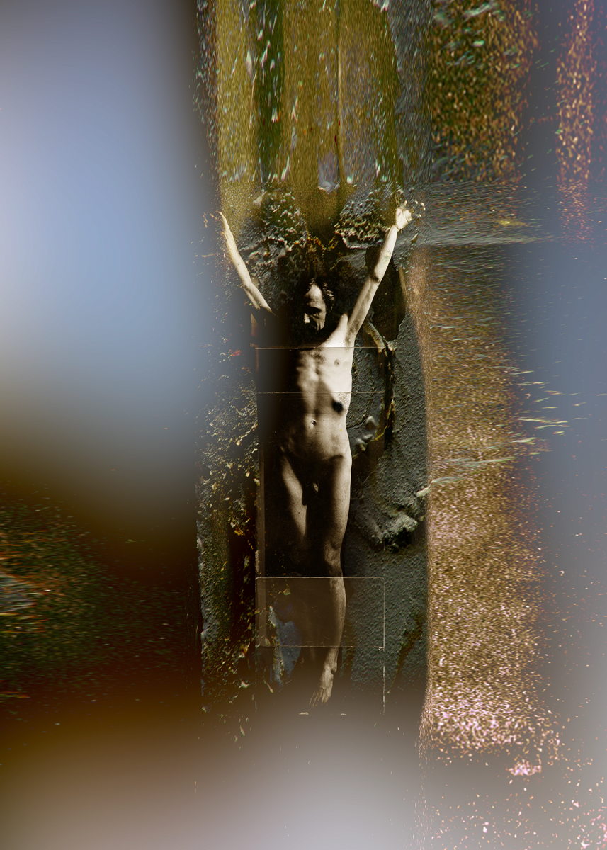 This digital artwork presents a solitary figure, arms stretched upward, merging with a textured, stone-like surface. The elongated stance conveys both surrender and endurance, as if the body has become part of the environment. Shadows carve the figure into the background, emphasizing the fragile line between human form and surrounding void.