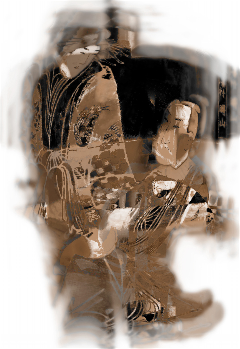 The muted palette of browns and blacks creates a dreamlike stillness, where silence seems as present as sound. Patterns resembling traditional fabrics and flowing lines intertwine with blurred contours, echoing both cultural memory and fleeting presence. The figures seem suspended between clarity and disappearance, much like thoughts shared at night, half-confessed and half-retained.