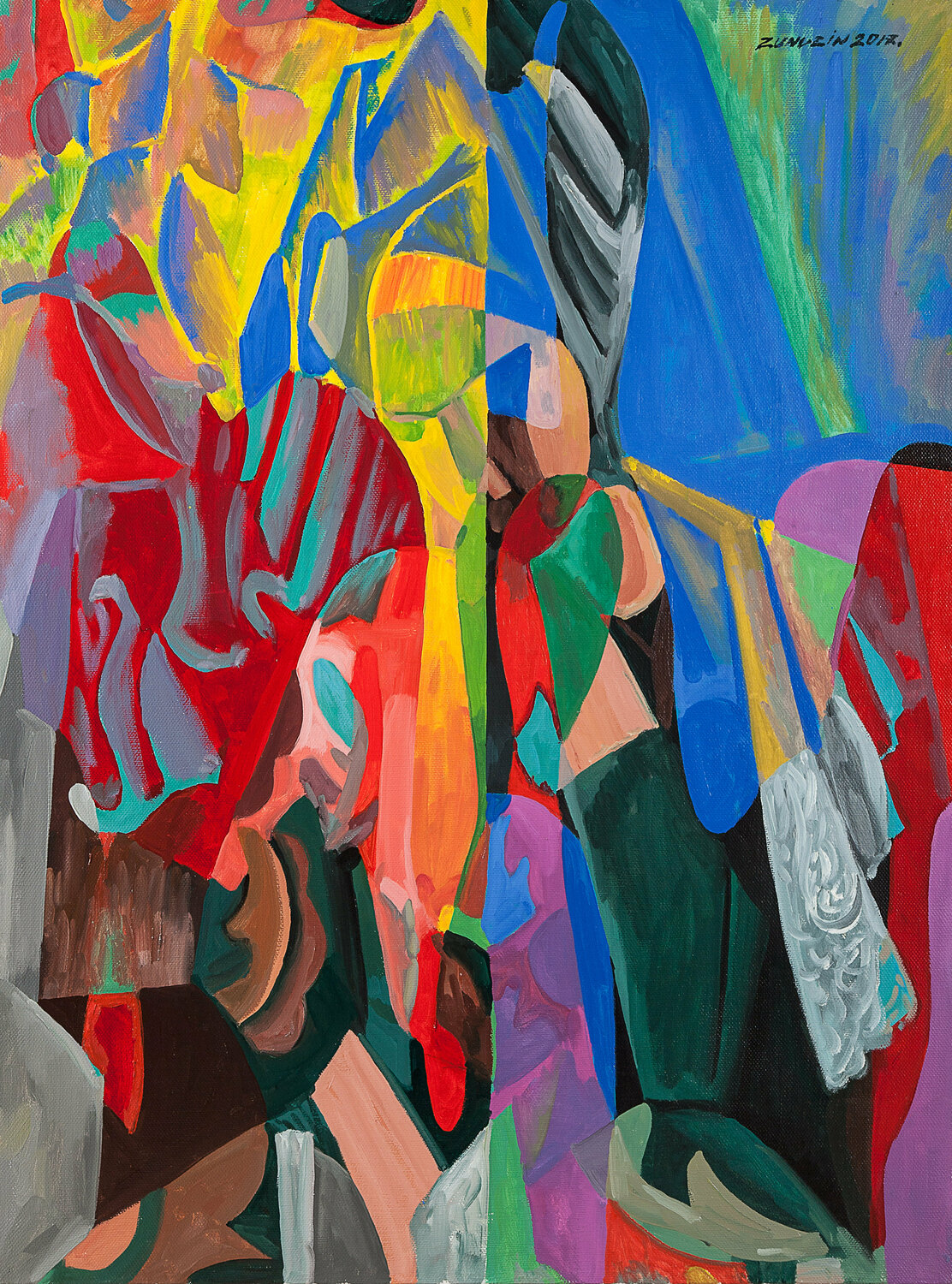 This painting, Queen Isabo (2017), bursts with energy through its kaleidoscope of colors and fractured forms. Vivid reds, yellows, blues, and greens overlap in sharp angular shapes, creating a sense of rhythm and movement across the canvas. The fragmented composition resists immediate clarity, inviting the eye to search for figures and meaning within its vibrant abstraction.