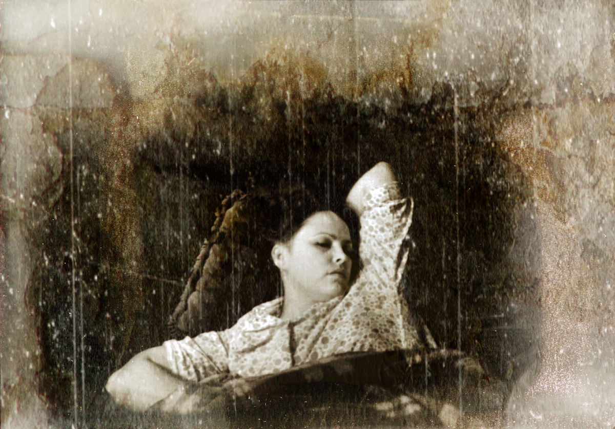 The surrounding textures, worn and layered like the passage of years, merge with the figure, as if time itself presses into the space of sleep. The muted tones—sepia, gray, and ochre—evoke memory and erosion, suggesting that dreams are held within the same fragile fabric as recollection.